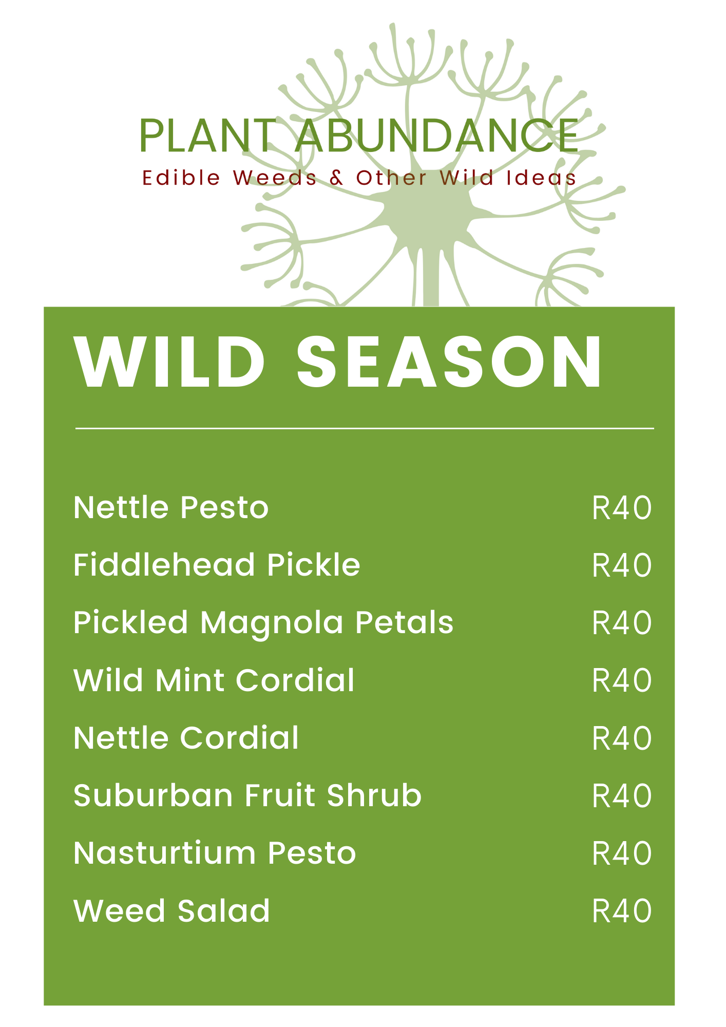 Next Wild Dates: Winter Solstice Wild Lunch 21 June in Howick; 28 – 30 August Montagu Herb Festival; September – Cape Town and surrounds.